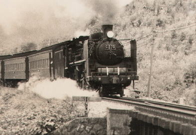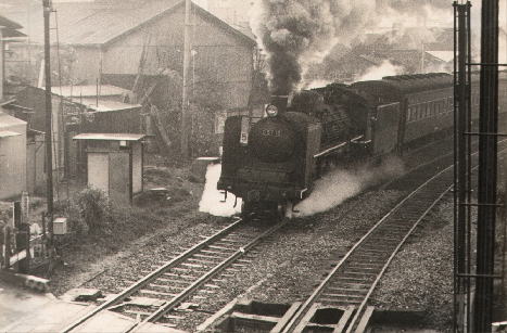 嵯峨駅を発車する旅客列車(C57形蒸気機関車)